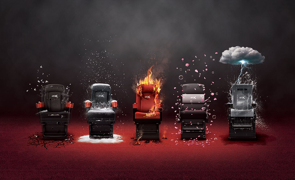 4DXは、映画のシーンに合わせて動くモーションシートに加え、風や光、霧、香り、振動など様々な環境効果を体感できる五感体験型の特別な上映システムです。